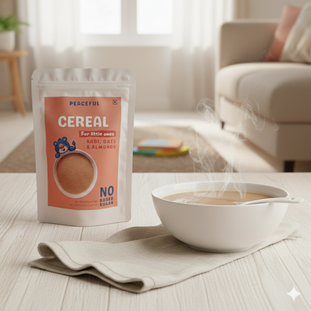 A gentle, wholesome cereal crafted for little tummies. Made from sprouted millets, real nuts, and natural sweetness from dates — with zero added sugar, salt, or preservatives. Every spoon delivers nourishment parents trust and taste babies love. Simple, pure and made just like home.